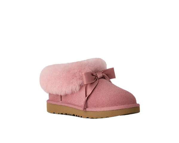 Going walking in a winter wonderland? Take little ones along with the ulra-cozy Bailey Slipper. It has a genuine suede upper with a sheepskin collar and fixed bow. Inside, tiny toes will be surrounded in our signature UGGplush™ lining and insole. Finished with a sugarcane EVA outsole, it's perfect for both indoor and outdoor wear.