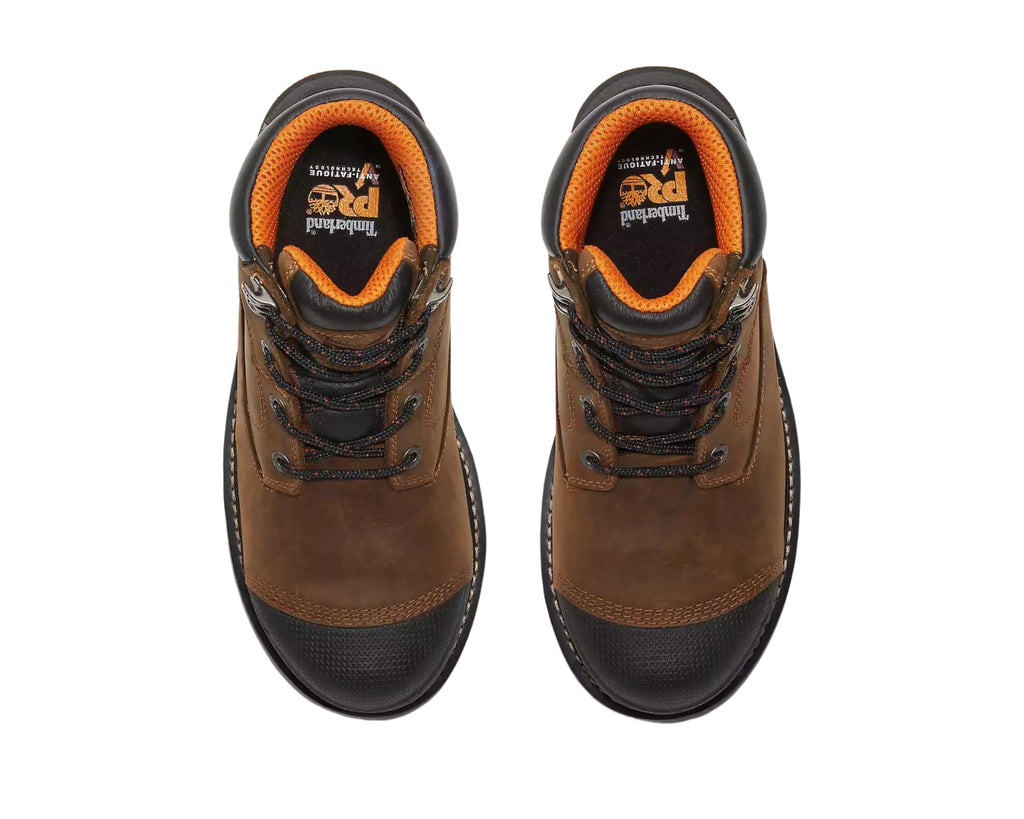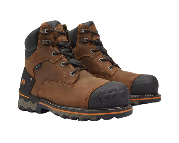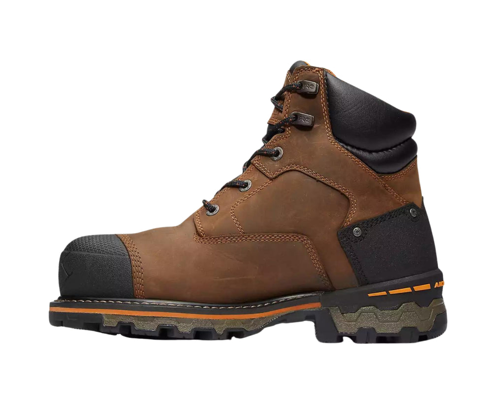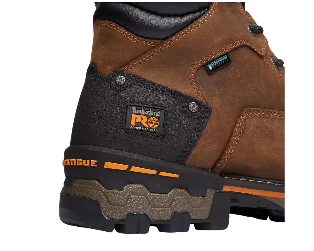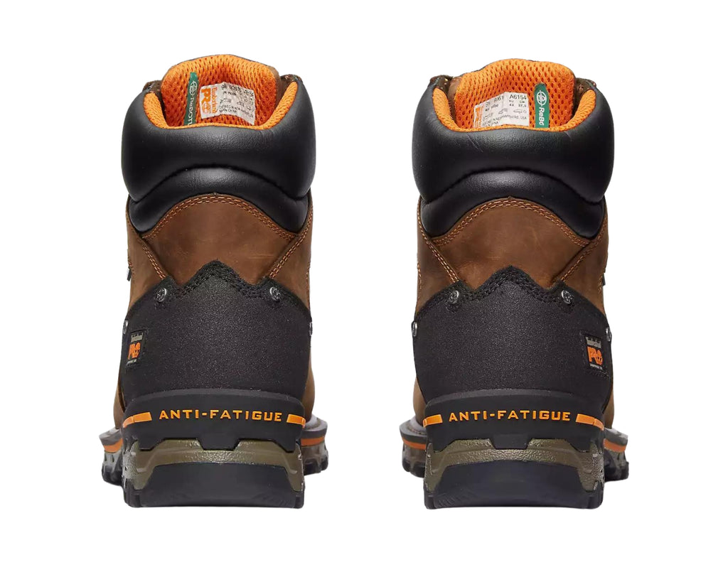 We designed our heavy-duty Boondock manufacturing boots to provide industrial-grade protection from every angle. Starting with their Premium Timberland® waterproof leather uppers with internal waterproof, breathable membranes for maximum waterproof protection and resistance to blood-borne pathogens, we added our molded Timberland PRO® rubber toe protectors that are as thick as standard boot outsoles and backed with composite safety toes, rigid external heel cups to support lateral movement, and our Anti-Fatigue Technology footbeds for all-day shock absorption and energy return. You'll also find protection from below with our heat-, slip-, oil, and abrasion-resistant, non-marking, lightweight, All-Weather TPU outsoles that offer enhanced traction in extreme environments. Plus, their breathable, moisture-wicking linings are made of ReBOTL™ fabric containing at least 50% recycled plastic with an antimicrobial treatment for odor control.